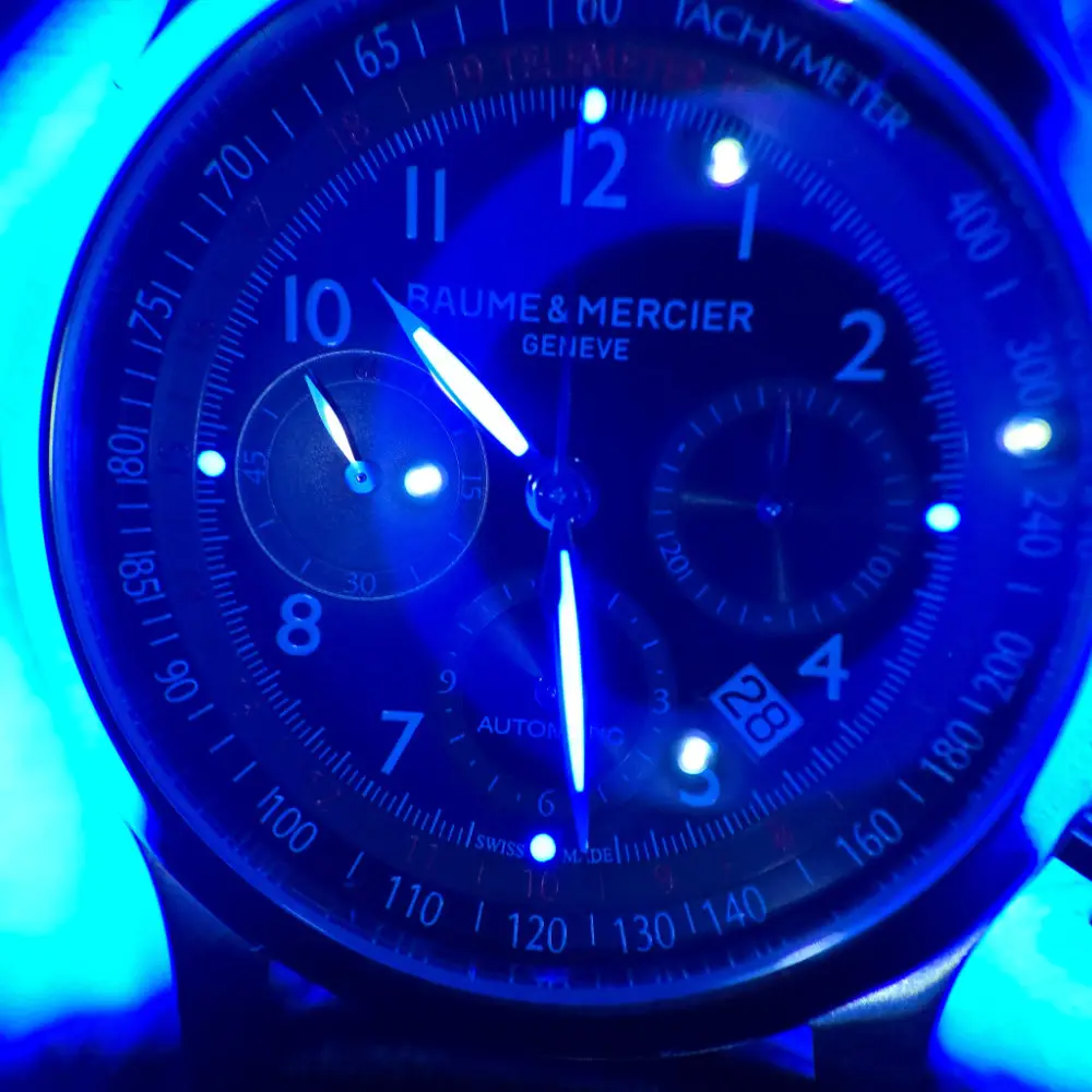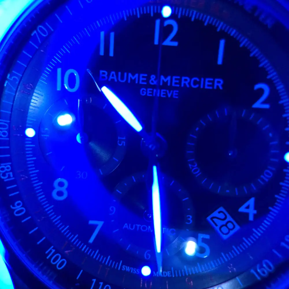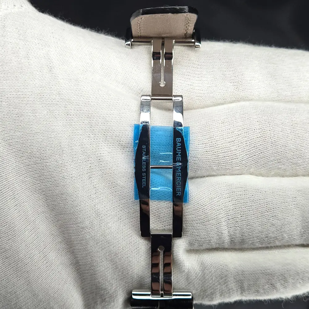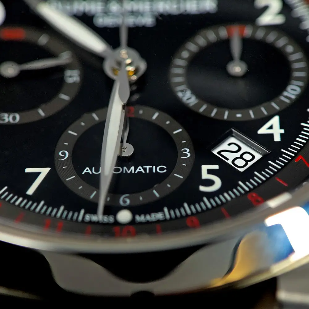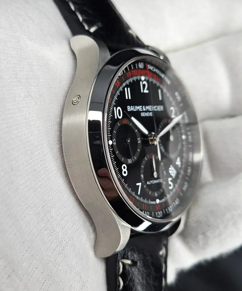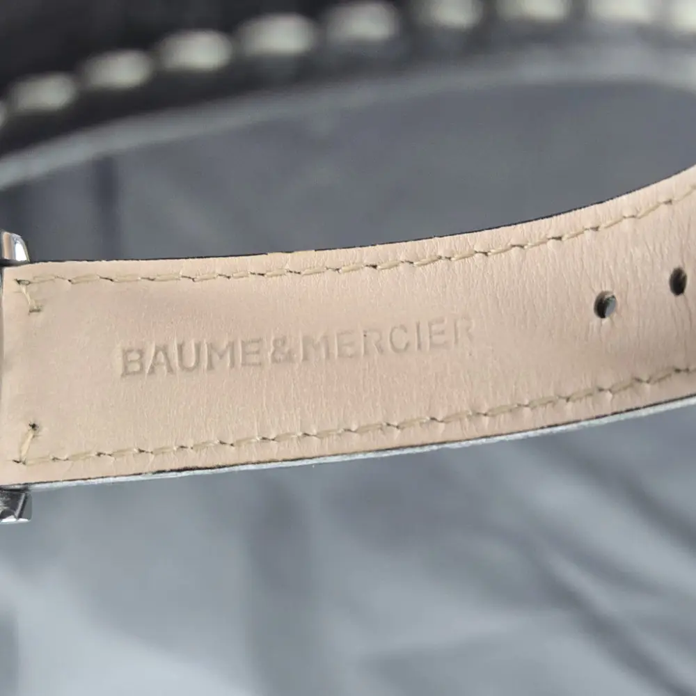 The watch sits on a rich black leather strap, stitched with the kind of precision that reminds you Baume & Mercier has been doing this since 1830. On the wrist, it feels balanced, confident, and unmistakably premium.
