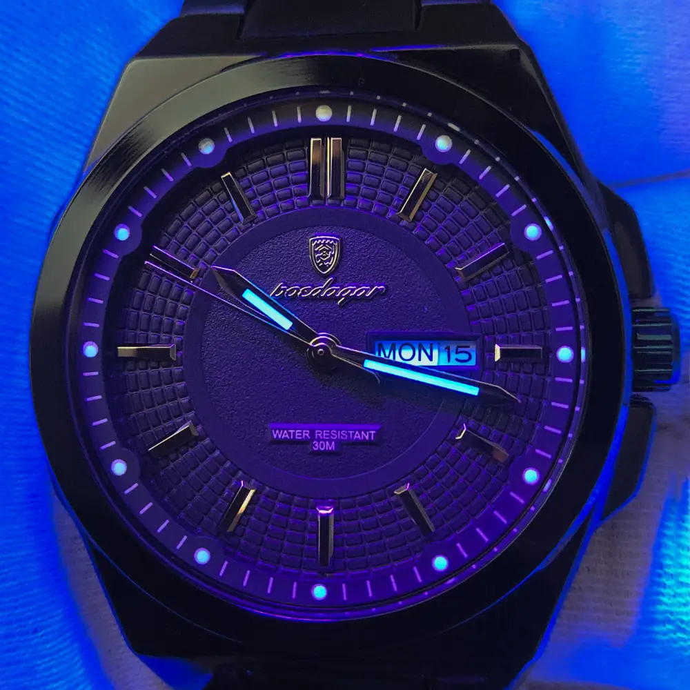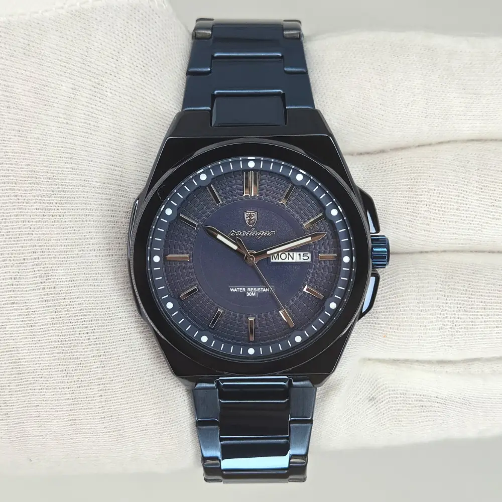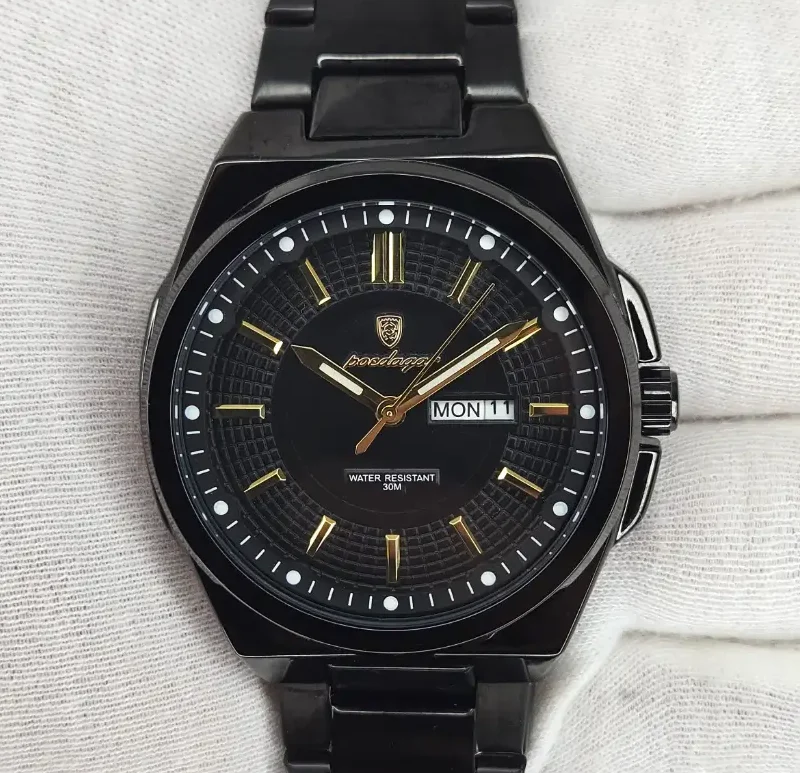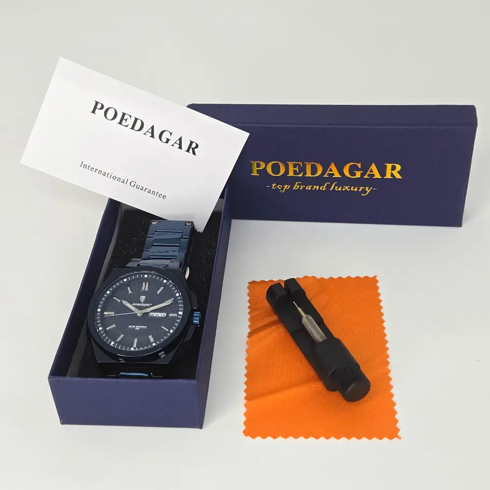 Bold, modern, and effortlessly refined, this POEDAGAR timepiece delivers an eye-catching luxury-inspired look at an accessible value. Crafted with a striking black stainless steel case and matching bracelet, it features a richly textured dial with luminous hands and markers, a convenient day-date display, and a clean numberless design that gives it a sleek, contemporary presence on the wrist. Powered by a reliable quartz movement, this 44mm watch offers everyday practicality with 3Bar water resistance, a hardlex crystal, and a push-button hidden clasp for a secure, comfortable fit. For buyers looking for strong visual presence, versatile daily wear, and standout style from a rising watch brand, this POEDAGAR is a sharp and affordable addition to any collection.