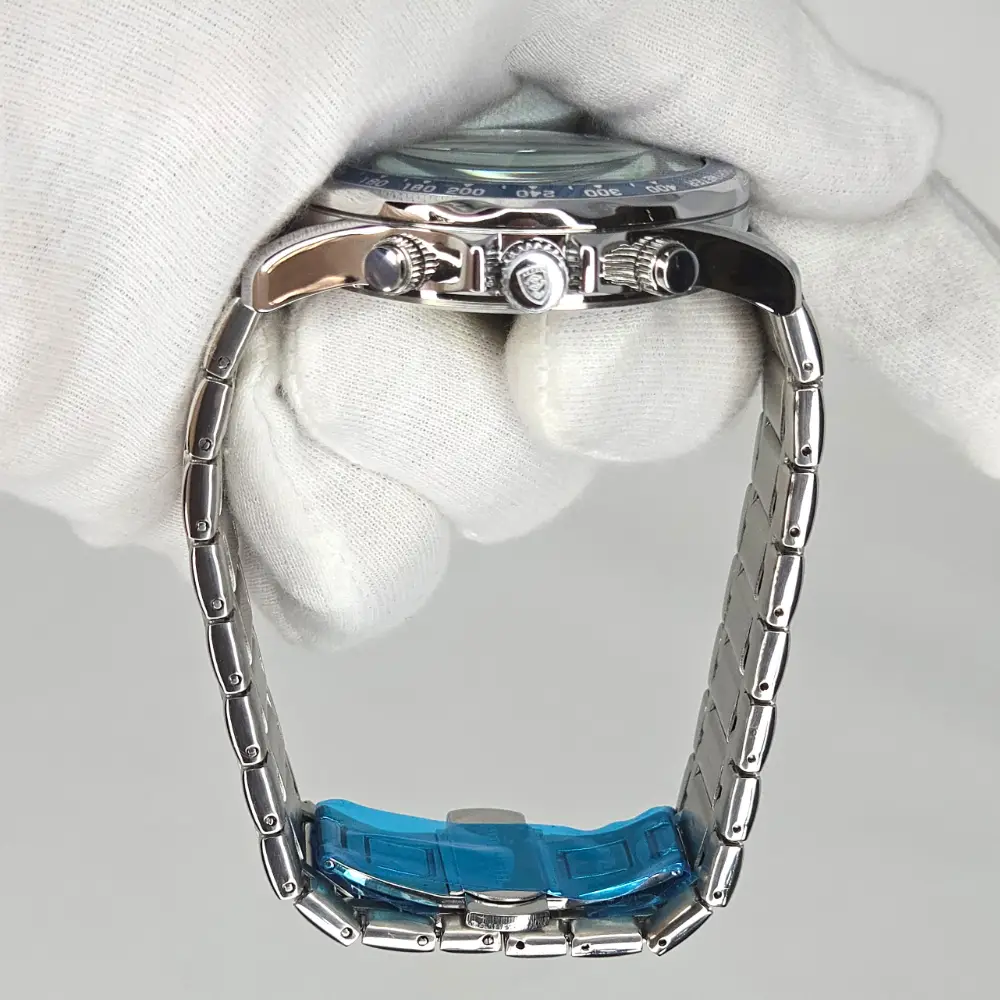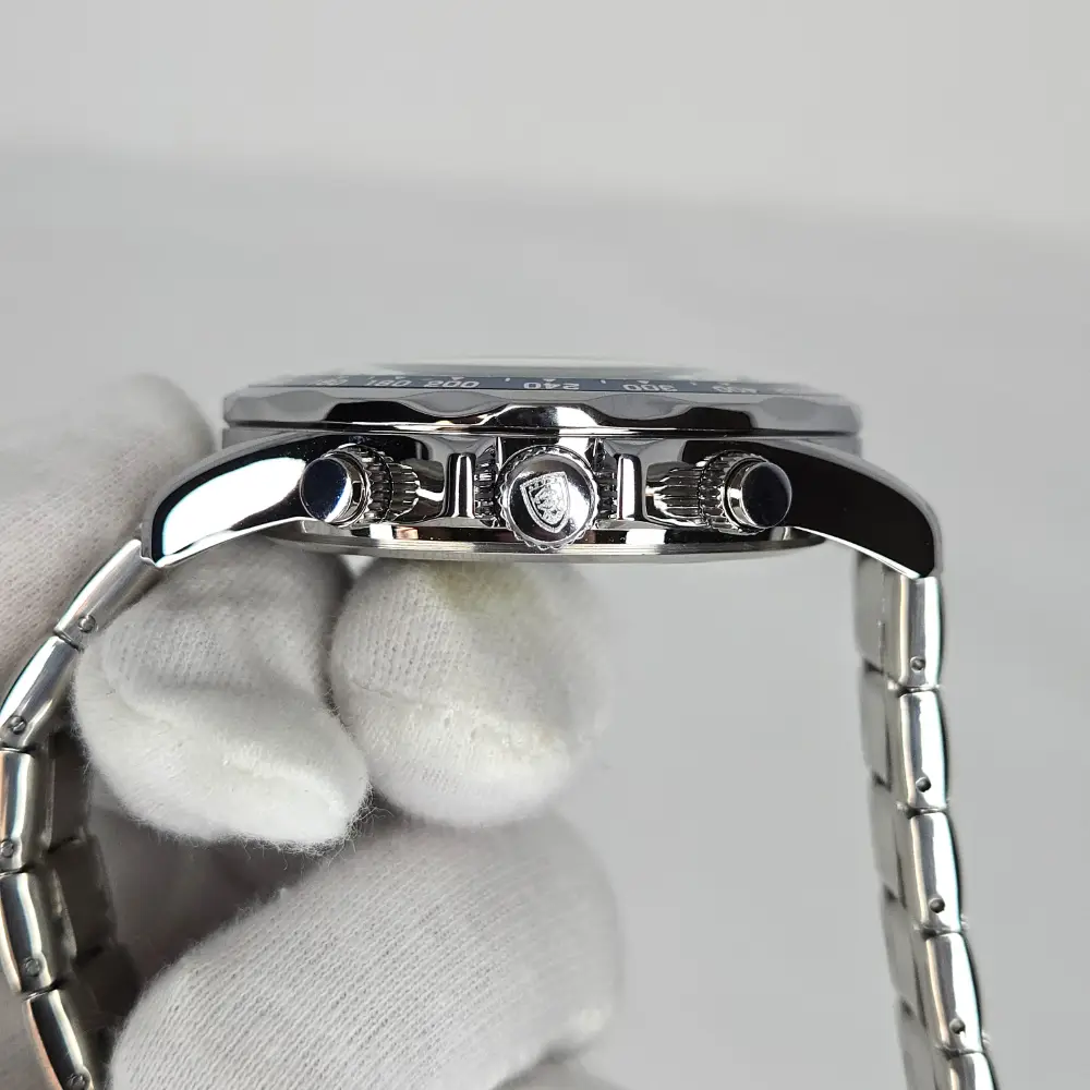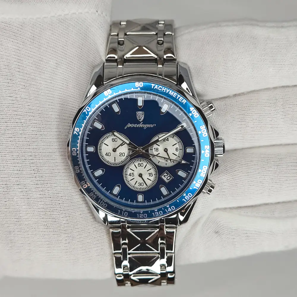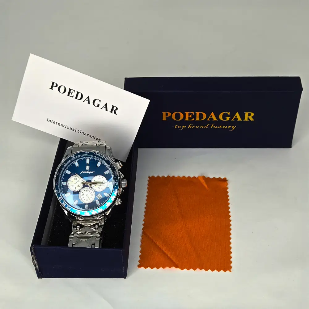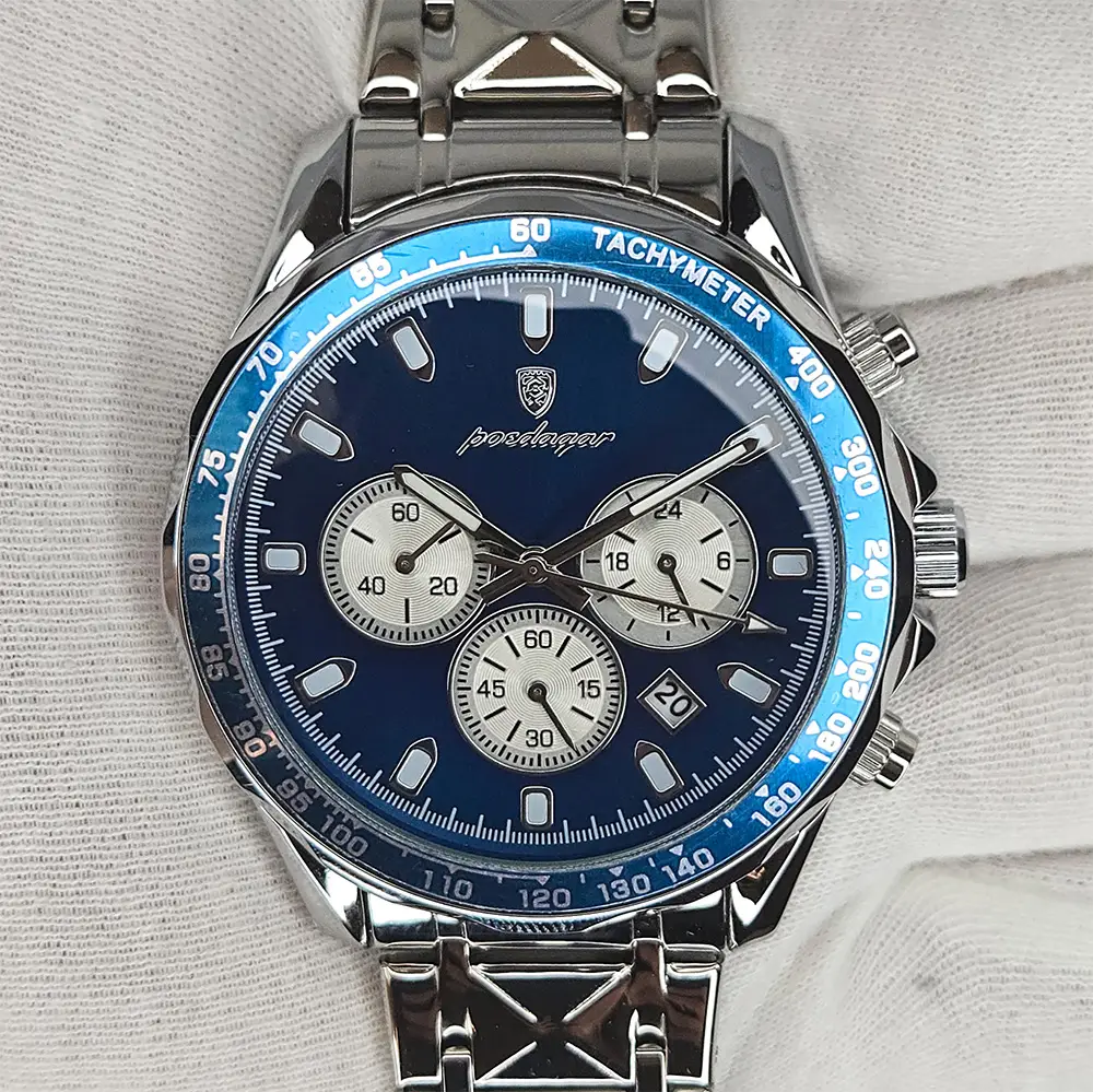 The POEDAGAR 815-WH1 delivers striking wrist presence with its crisp silver-white dial, vivid blue chronograph registers, and polished stainless steel construction. Designed with a sporty yet refined aesthetic, this quartz timepiece blends everyday practicality with the bold visual language collectors love, featuring luminous hands, date display, tachymeter styling, and chronograph stylish features. The 44mm case size gives it a confident presence on the wrist, while the integrated stainless steel bracelet and clean dial layout make it a sharp choice for anyone who wants the luxury look without sacrificing versatility. For the buyer seeking an affordable watch with strong visual impact and modern business-sport styling, this piece offers impressive value and unmistakable character.