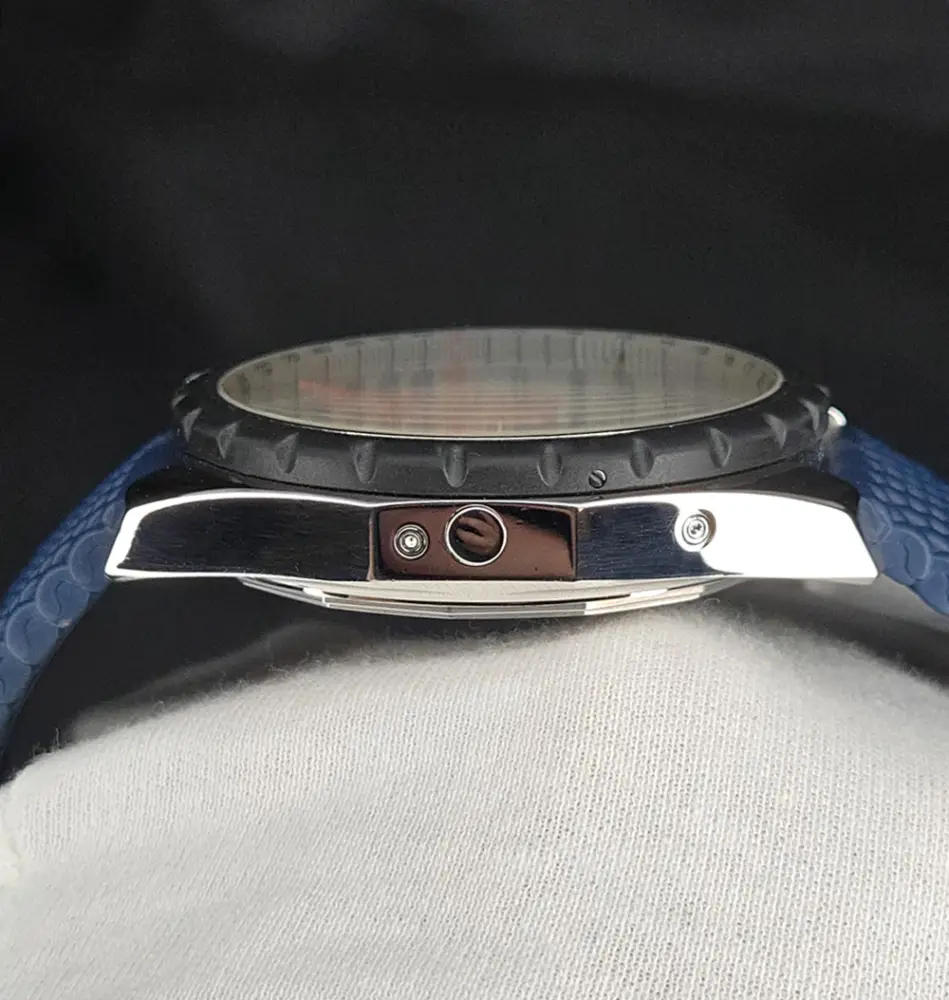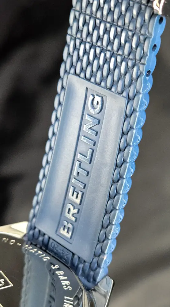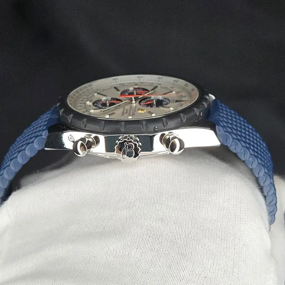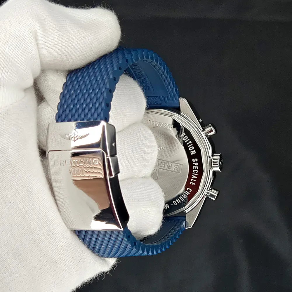 The polished stainless‑steel case delivers commanding wrist presence at 49 mm, yet remains refined with its sculpted lines and balanced proportions. Paired with a black Breitling Pro Diver rubber strap and a matching black rubber bezel, the watch achieves a modern, technical aesthetic that complements its aviation‑inspired heritage.
