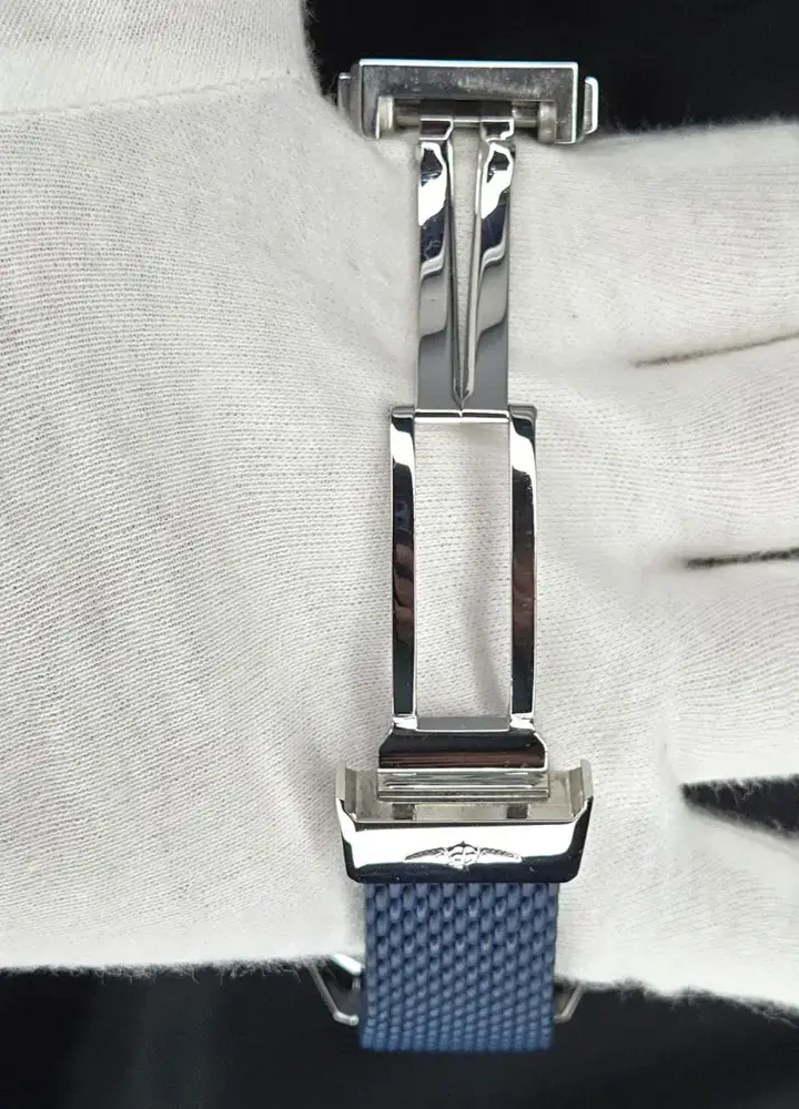 The polished stainless‑steel case delivers commanding wrist presence at 49 mm, yet remains refined with its sculpted lines and balanced proportions. Paired with a black Breitling Pro Diver rubber strap and a matching black rubber bezel, the watch achieves a modern, technical aesthetic that complements its aviation‑inspired heritage.