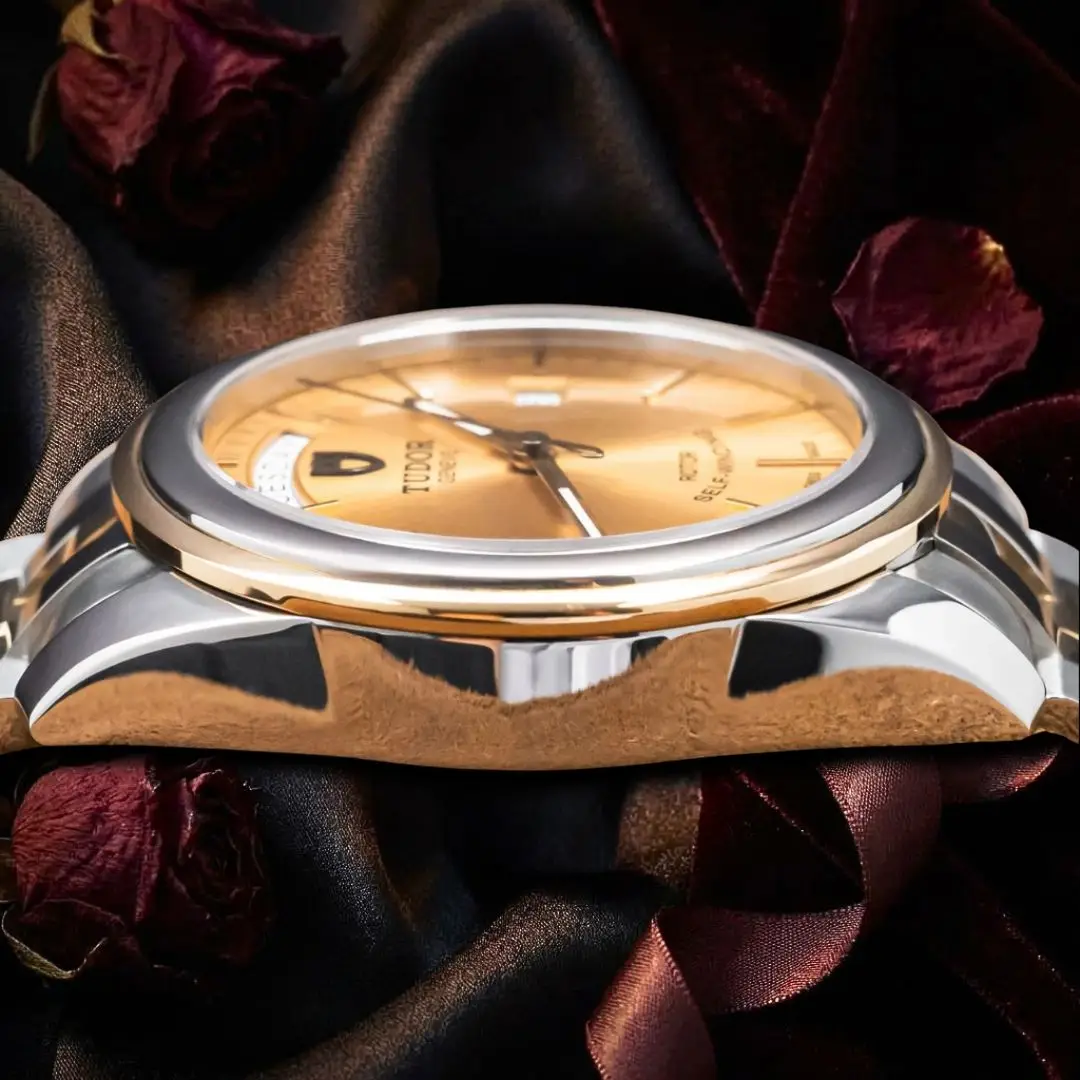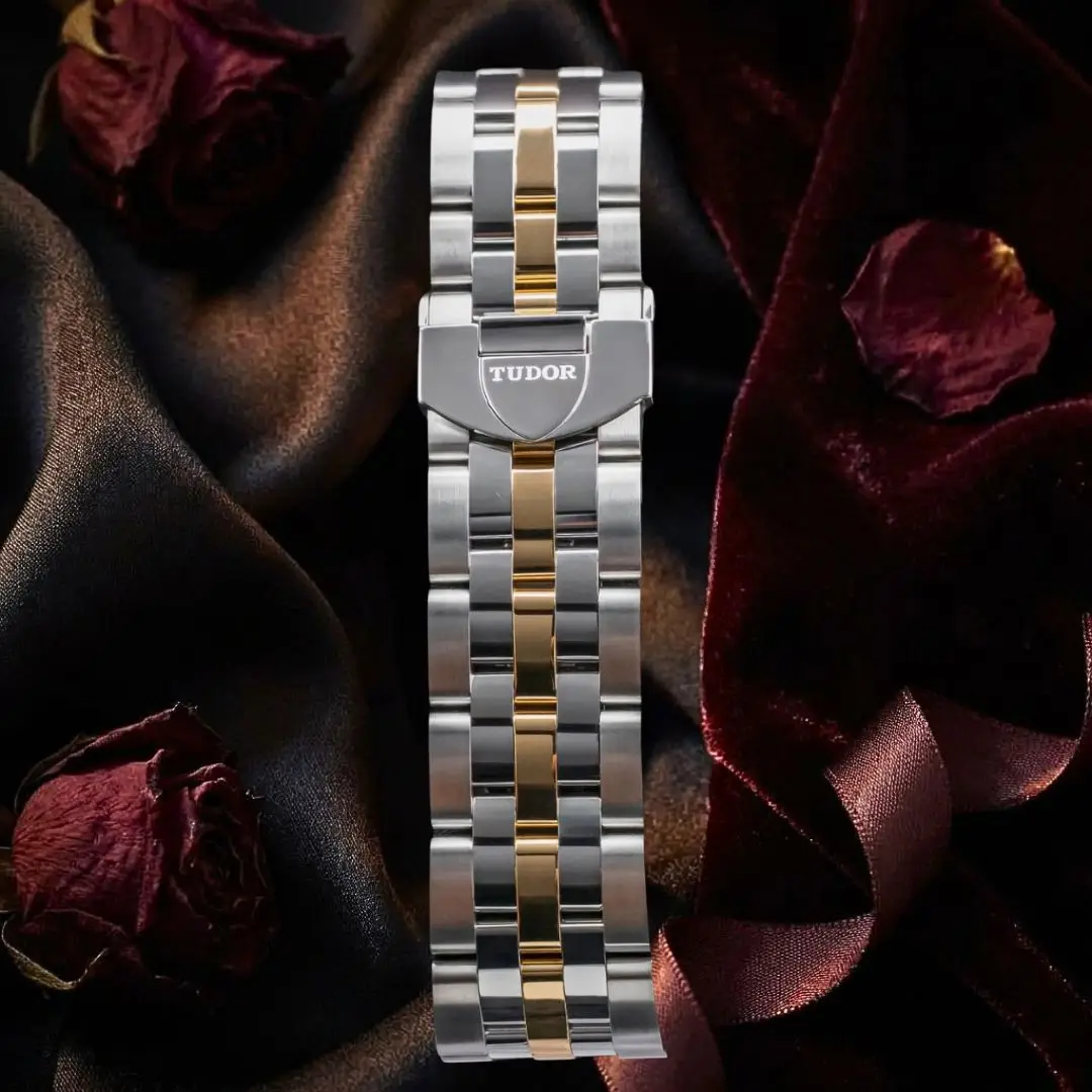 The polished stainless‑steel case is crowned with an 18K yellow‑gold–capped bezel, giving the watch a warm, luxurious glow that catches light with every movement. This same gold‑capped construction continues through the bracelet’s center links, creating a seamless two‑tone aesthetic that feels rich, substantial, and unmistakably upscale. Tudor’s gold‑cap technique provides the look and feel of solid gold with exceptional durability — a detail seasoned collectors appreciate.