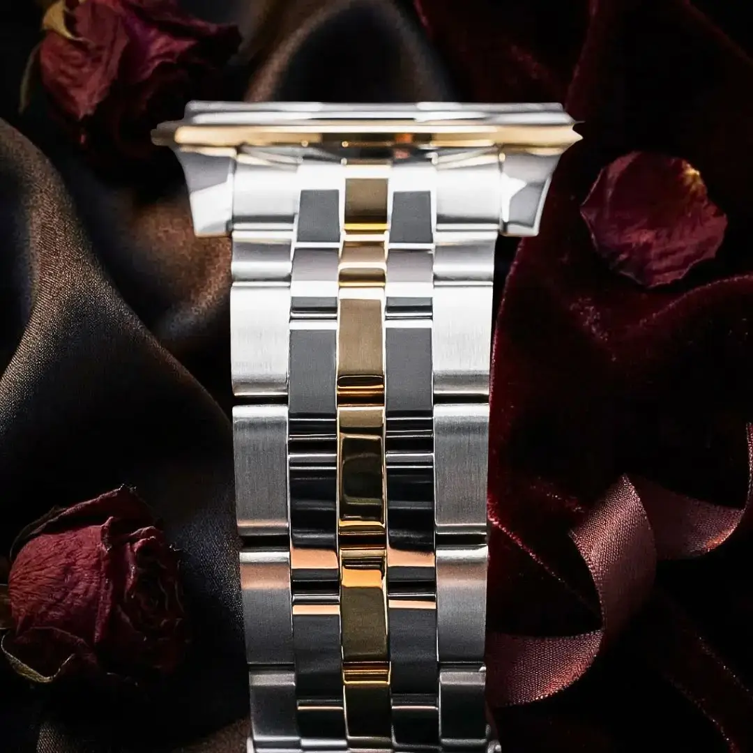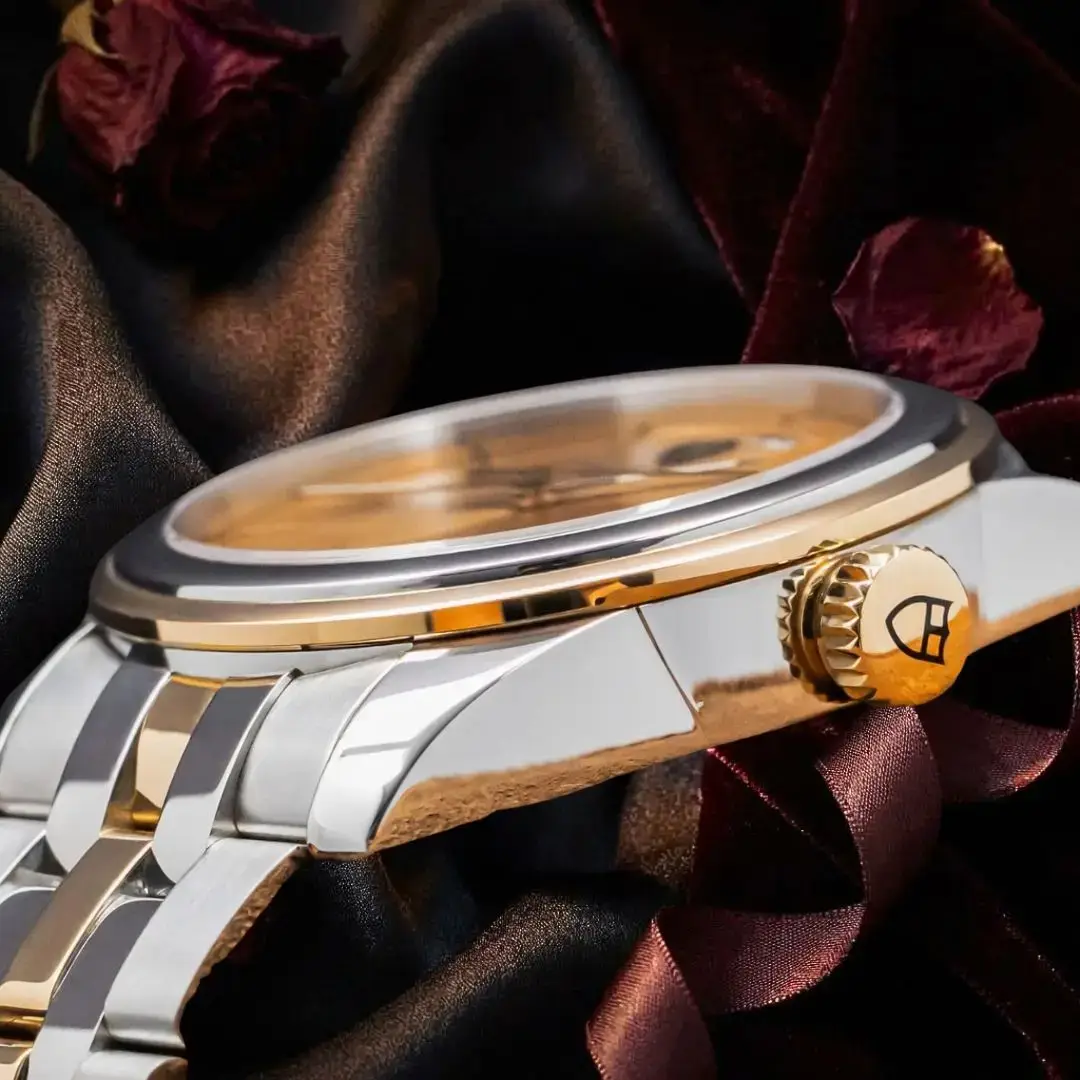 The champagne‑gold dial is where the watch truly comes alive. Sunlit, refined, and beautifully balanced, it features a full day display at 12 o’clock and a crisp date window at 3, framed by luminous hands and markers that maintain perfect legibility. It’s a dial that radiates quiet luxury — the kind of understated opulence that never goes out of style.